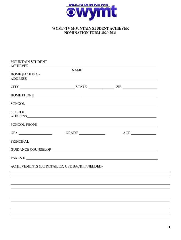 WYATT MOUNTAIN STUDENT ACHIEVER NOMINATION FORM 20202021MOUNTAIN STUDENT ACHIEVER___ NAME HOME (MAILING) ADDRESS___ CITY ___ STATE: ___ ZIP: ___ HOME PHONE___ SCHOOL___ SCHOOL ADDRESS___ SCHOOL PHONE___