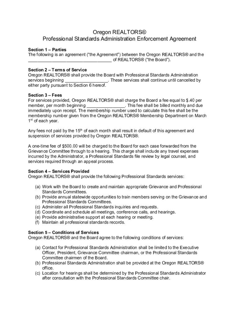 Oregon REALTORS Professional Standards Administration Enforcement Agreement Section 1 Parties The following is an agreement (the Agreement) between the Oregon REALTORS and the ___ of REALTORS (the