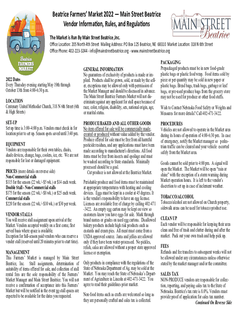 Beatrice Farmers Market 2022 Main Street Beatrice Vendor Information, Rules, and Regulations The Market is Run By Main Street Beatrice, Inc. Office Location: 205 North 4th Street Mailing Address: