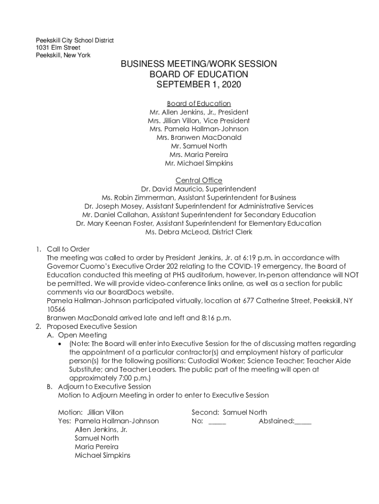 Peek skill City School District 1031 Elm Street Peek skill, New Agribusiness MEETING/WORK SESSION BOARD OF EDUCATION SEPTEMBER 1, 2020, Board of Education Mr. Allen Jenkins, Jr., President Mrs. Jillian