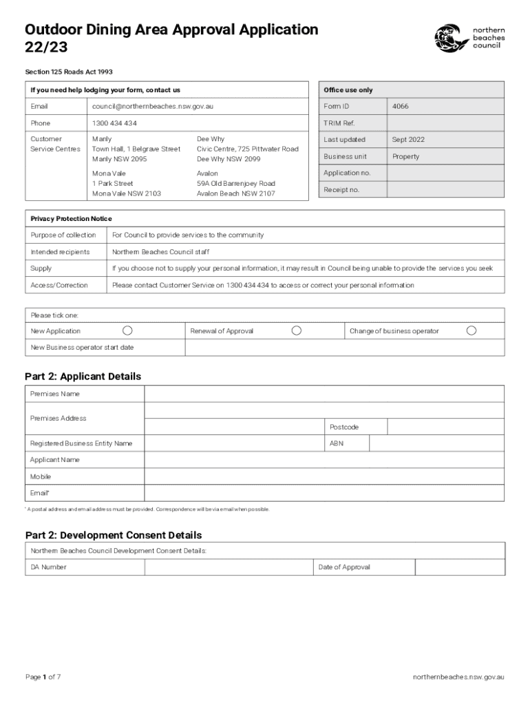 Outdoor Dining Area Approval Application 22/23 Section 125 Roads Act 1993 If you need help lodging your form, contact office use onlyEmailcouncil@northernbeaches.nsw.gov.auForm IDPhone1300 434 434TRIM
