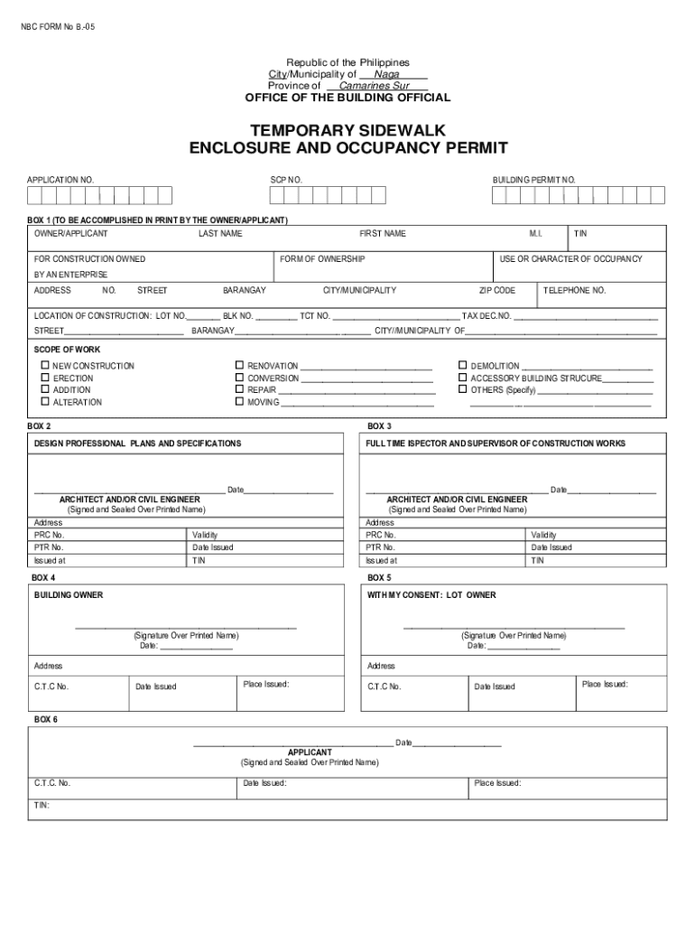 NBC FORM No B.05Republic of the Philippines City/Municipality of Nāga Province of Ca marines SUR OFFICE OF THE BUILDING OFFICIALTEMPORARY SIDEWALK ENCLOSURE AND OCCUPANCY PERMIT APPLICATION NO.SCP
