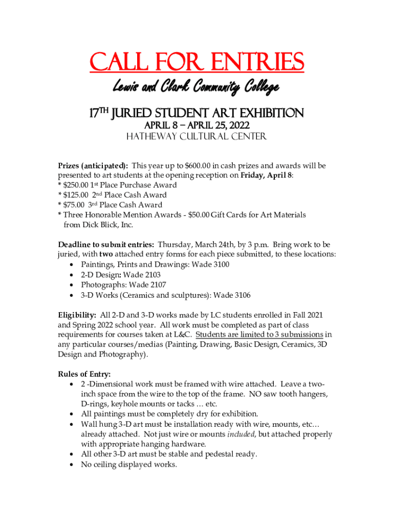 Call for Entries Lewis and Clark Community College17th BURIED Student Art Exhibition April 8 April 25, 2022, Hathaway Cultural Enterprises (anticipated): This year up to $600.00 in cash prizes and