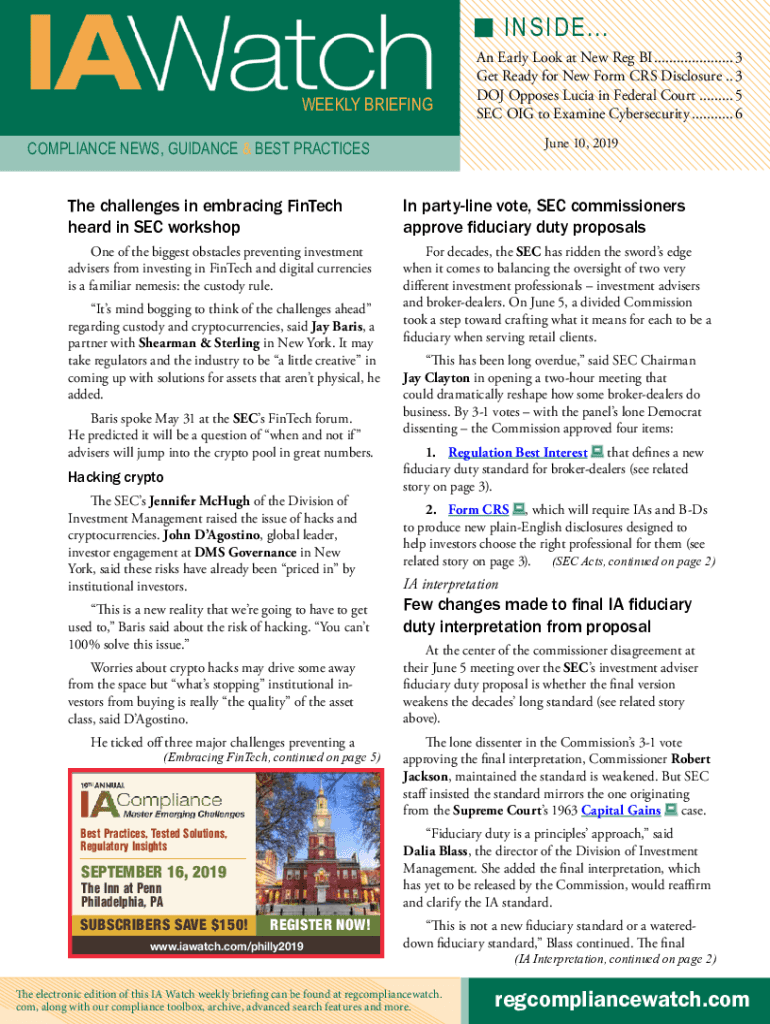 INSIDE... WEEKLY Briefing Early Look at New Reg BI ..................... 3 Get Ready for New Form CRS Disclosure. 3 DOJ Opposes Lucia in Federal Court ......... 5 SEC OIL to Examine Cybersecurity