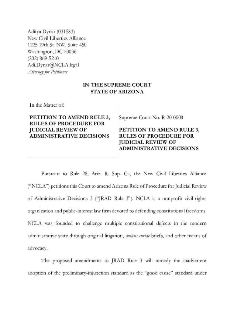 Aditya Dinar (031583) New Civil Liberties Alliance 1225 19th St. NW, Suite 450 Washington, DC 20036 (202) 8695210 Adi.Dynar@NCLA.legal Attorney for Petitioner IN THE SUPREME COURT STATE OF ARIZONA
