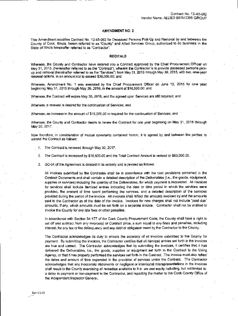 This Amendment modifies Contract No. 1345082 for Deceased Persons Pickup and Removal by and between the