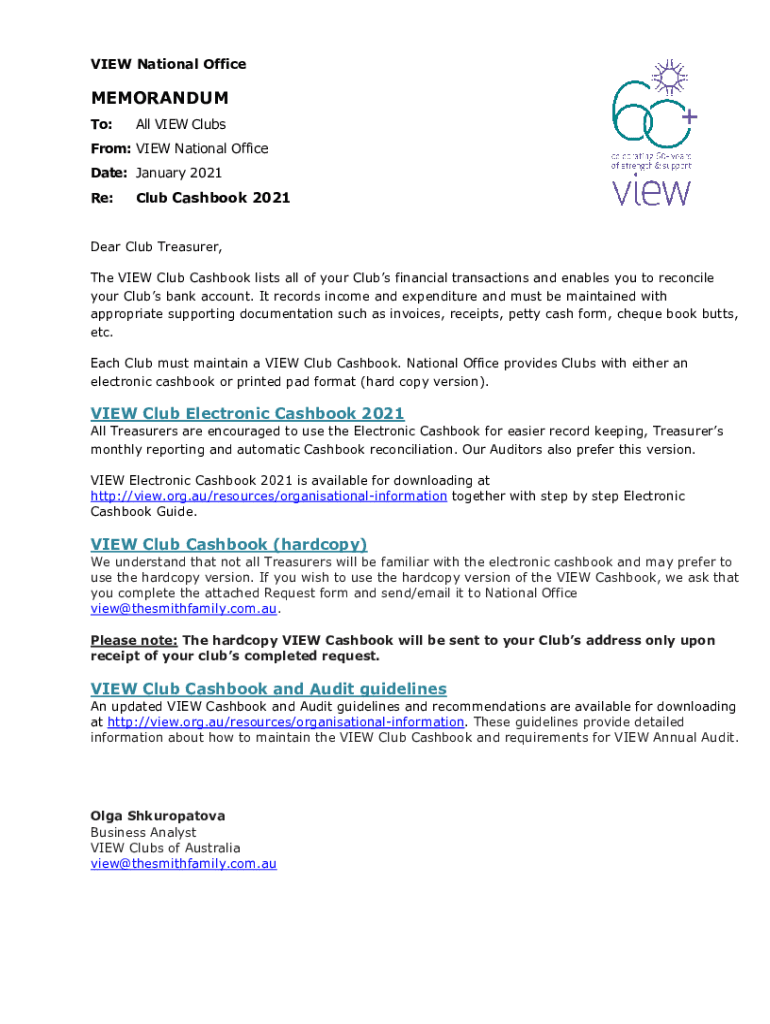VIEW National OfficeMEMORANDUM To:All VIEW Clubfoot: VIEW National Office Date: January 2021 Re:Club Cashbook 2021Dear Club Treasurer, The VIEW Club Cashbook lists all of your Clubs financial transactions