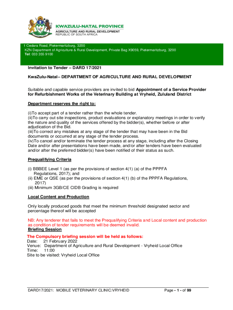 1 Cedar Road, Pietermaritzburg, 3200 KIN Department of Agriculture & Rural Development, Private Bag X9059, Pietermaritzburg, 3200 Tells: 033 355 9100Invitation to Tender HARD 17/2021 KwaZuluNatal