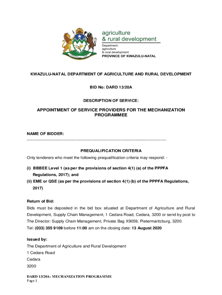KWAZULUNATAL DEPARTMENT OF AGRICULTURE AND RURAL DEVELOPMENT BID No: HARD 13/20ADESCRIPTION OF SERVICE:APPOINTMENT OF SERVICE PROVIDERS FOR THE MECHANIZATION PROGRAMMEENAME OF BIDDER: ___ PREQUALIFICATION