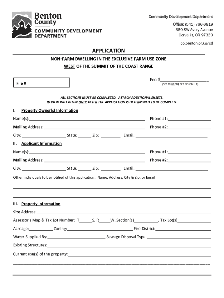 Community Development Department Office: (541) 7666819 360 SW Avery Avenue Corvallis, OR 97330 co.benton.or.us/cdAPPLICATION NONFARM DWELLING IN THE EXCLUSIVE FARM USE ZONE WEST OF THE SUMMIT OF THE