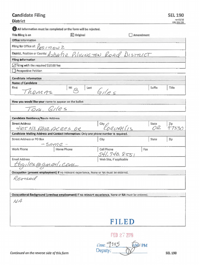 Candidate Filing District0SEL 190 revolt/16 ORS2S5.235All Information must be completed or the form will be rejected. Originates filing Is an0AmendmentOffice Information Filing for Office of’s \”