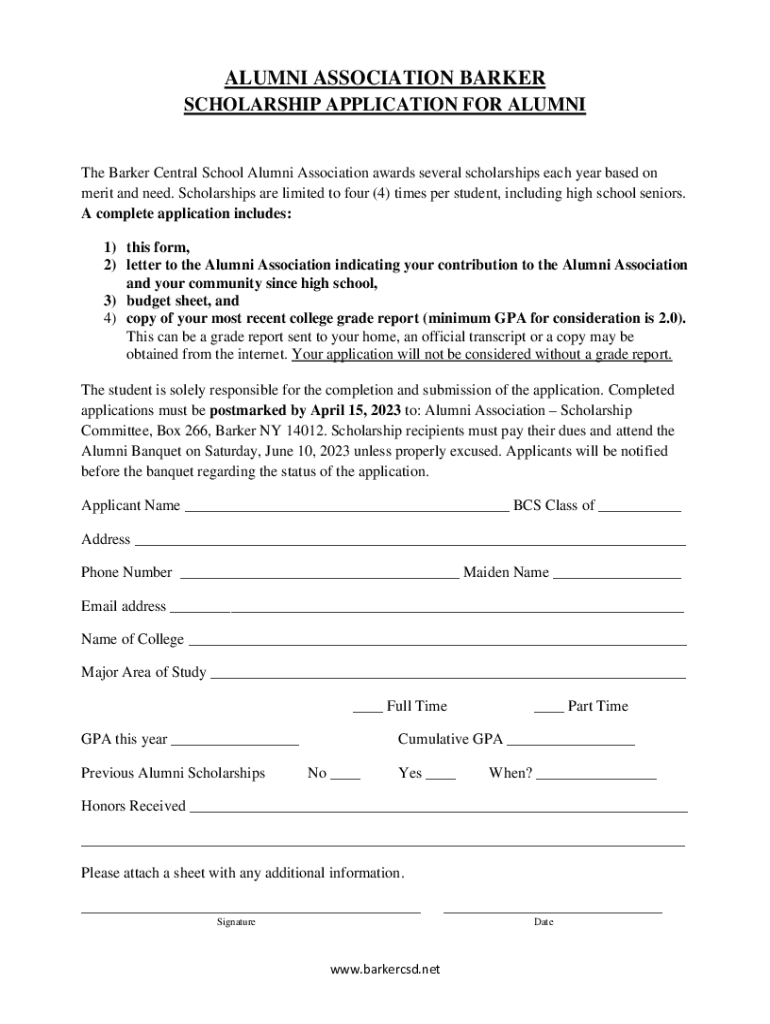 ALUMNI ASSOCIATION BARKER SCHOLARSHIP APPLICATION FOR Alumni Barker Central School Alumni Association awards several scholarships each year based on merit and need. Scholarships are limited to four