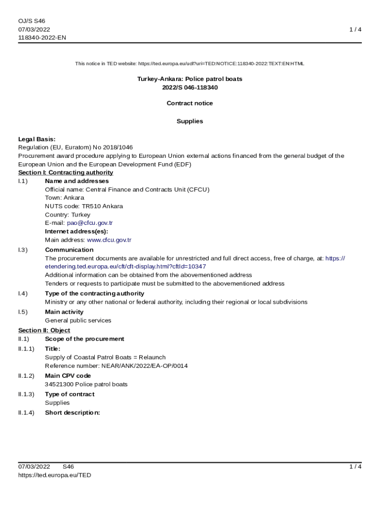 OJ/S S46 07/03/2022 1183402022EN1/4This notice in TED website: https://ted.europa.eu/udl?uriTED:NOTICE:1183402022:TEXT:EN:HTMLTurkeyAnkara: Police patrol boats 2022/S 046118340 Contract notice Supplies