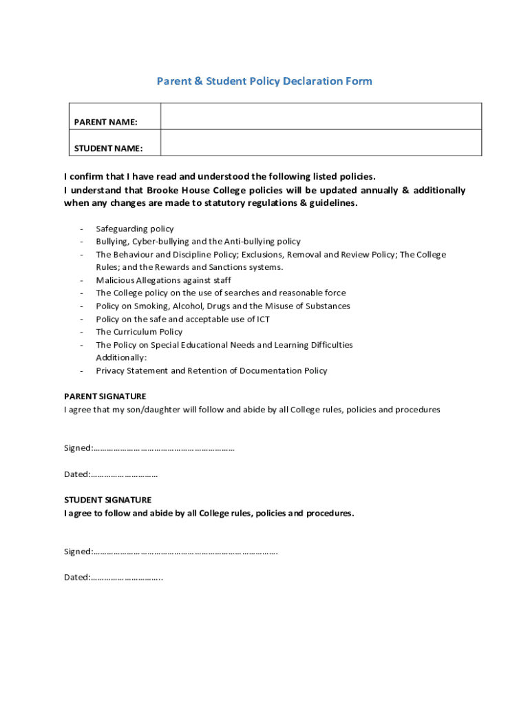 Parent & Student Policy Declaration Firmament NAME: STUDENT NAME:I confirm that I have read and understood the following listed policies. I understand that Brooke House College policies will be updated