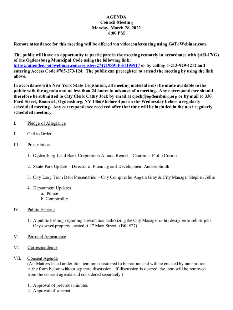 AGENDA Council Meeting Monday, March 28, 2022 6:00 PM Remote attendance for this meeting will be offered via videoconferencing using GoToWebinar.com. The public will have an opportunity to participate