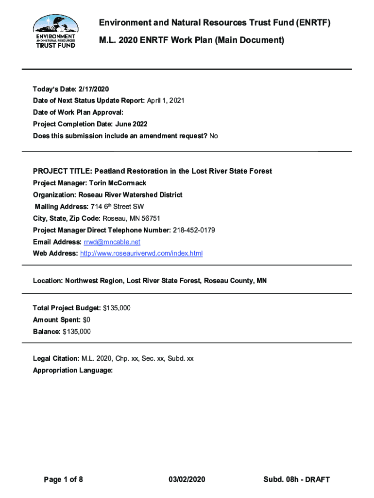 Environment and Natural Resources Trust Fund (EN RTF) M.L. 2020 EN RTF Work Plan (Main Document)Today's Date: 2/17/2020 Date of Next Status Update Report: April 1, 2021, Date of Work Plan Approval: