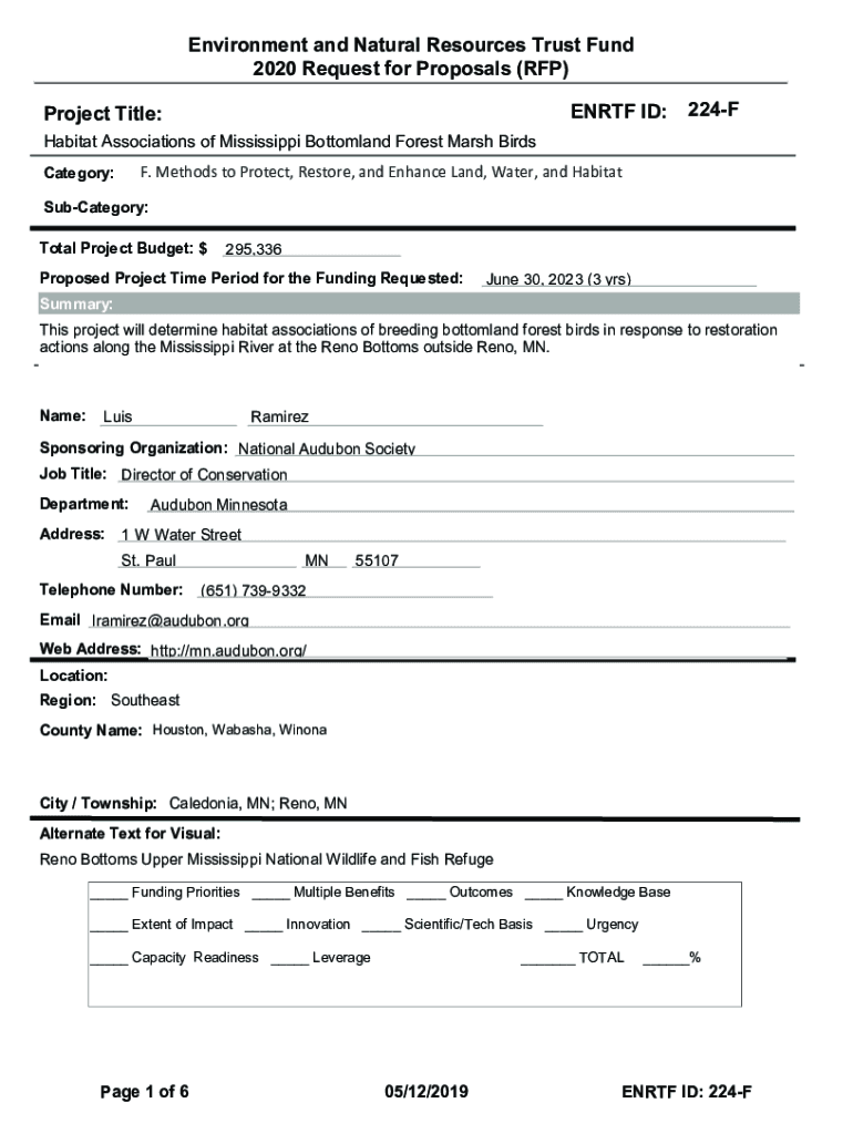 Environment and Natural Resources Trust Fund 2020 Request for Proposals (RFP) EN RTF ID:Project Title:224FHabitat Associations of Mississippi Bottom land Forest Marsh Birds F. Methods to Protect,