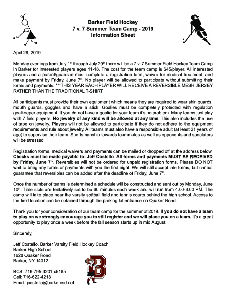 Barker Field Hockey 7 v. 7 Summer Team Camp 2019 Information Sheet April 28, 2019, Monday evenings from July 1st through July 29th there will be a 7 v. 7 Summer Field Hockey Team Camp in Barker for