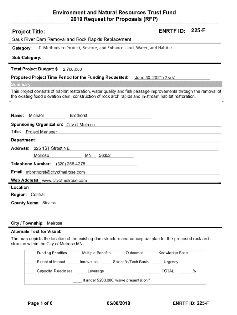 Environment and Natural Resources Trust Fund 2019 Request for Proposals (RFP) EN RTF ID:Project Title:225FSauk River Dam Removal and Rock Rapids Replacement Category:F. MethodstoProtect, Restore,