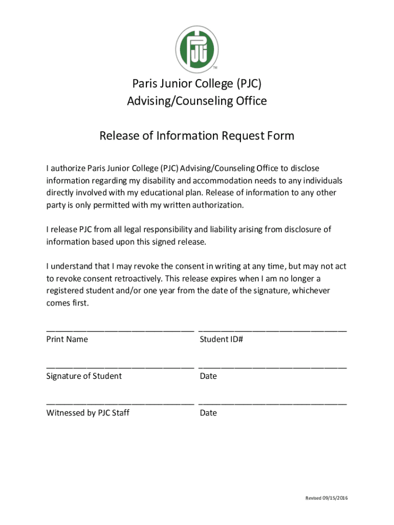Get the free Paris Junior College (PJC) Advising/Counseling Office Release of ...