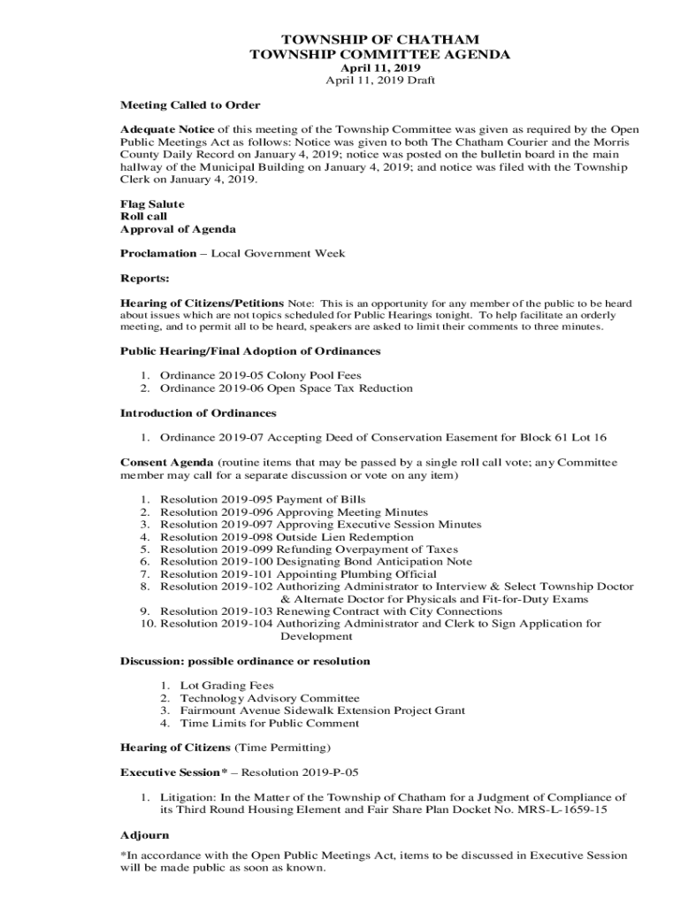 TOWNSHIP OF CHATHAM TOWNSHIP COMMITTEE AGENDA April 11, 2019, April 11, 2019, Draft Meeting Called to Order Adequate Notice of this meeting of the Township Committee was given as required by the Open
