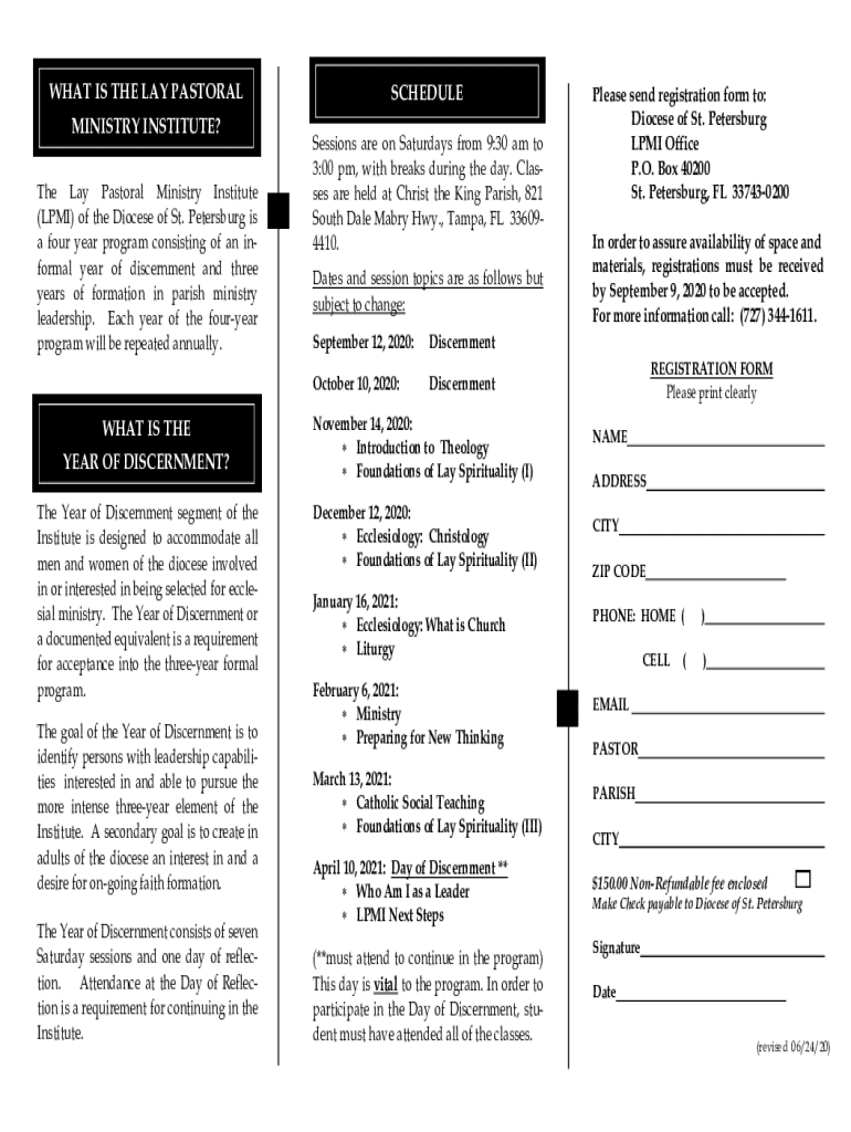 WHAT IS THE LAY PASTORAL MINISTRY INSTITUTE? The Lay Pastoral Ministry Institute (PMI) of the Diocese of St. Petersburg is a four-year program consisting of an informal year of discernment and three