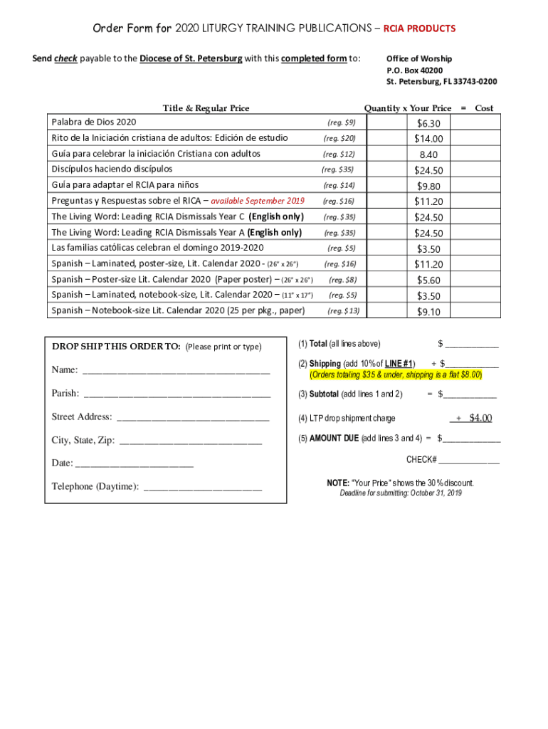 Order Form for 2020 LITURGY TRAINING PUBLICATIONS CIA PRODUCTS Send check payable to the Diocese of St. Petersburg with this completed form to:Title & Regular PriceOffice of Worship P.O. Box 40200