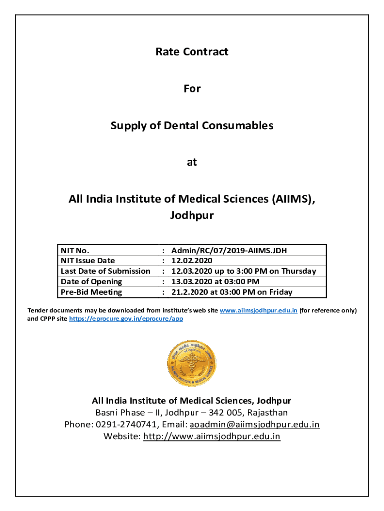 Rate Contract For Supply of Dental Consumables at All India Institute of Medical Sciences (AIMS), Jodhpur NIT No. NIT Issue Date Last Date of Submission Date of Opening PreBid Meeting: : : : :Admin/RC/07/2019AIIMS.JD