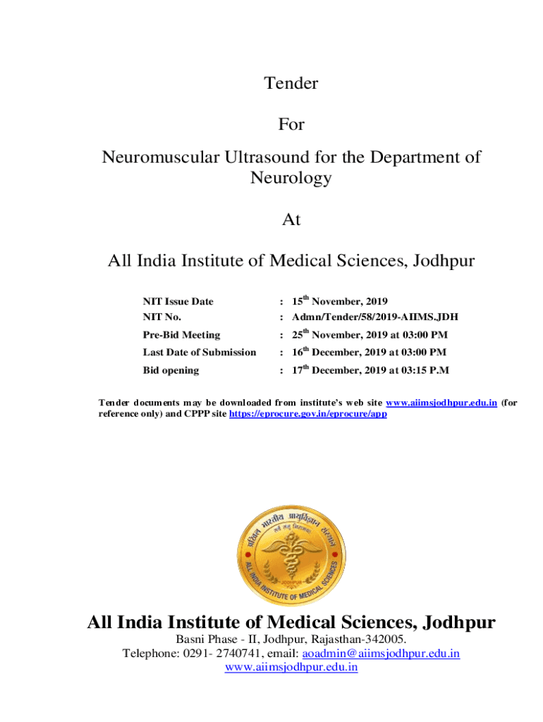Tender For Neuromuscular Ultrasound for the Department of Neurology At All India Institute of Medical Sciences, Jodhpur NIT Issue Date: 15th November, 2019NIT No.: Aden/Tender/58/2019AIIMS. Prebid