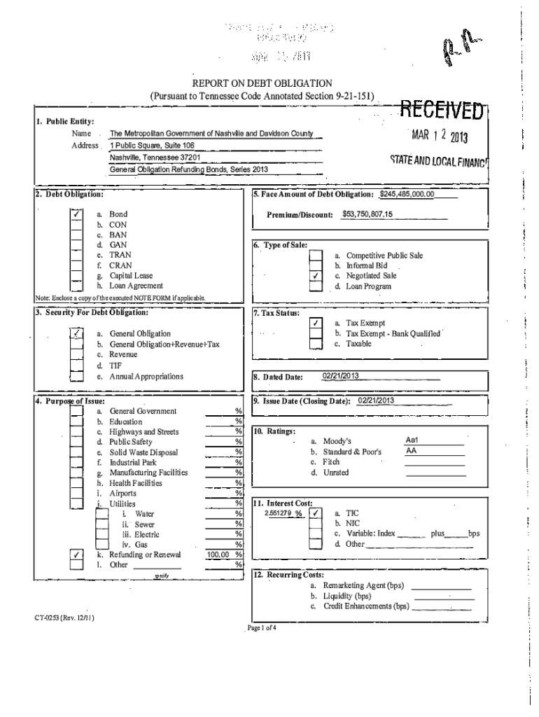 REPORT ON DEBT OBLIGATION (Pursuant to Tennessee Code Annotated Section 921_151) 1. Public Entity:. MAR 1 2 2013Name The Metropolitan Government of Nashville and Davidson County Address. 1 Pu. Bloc