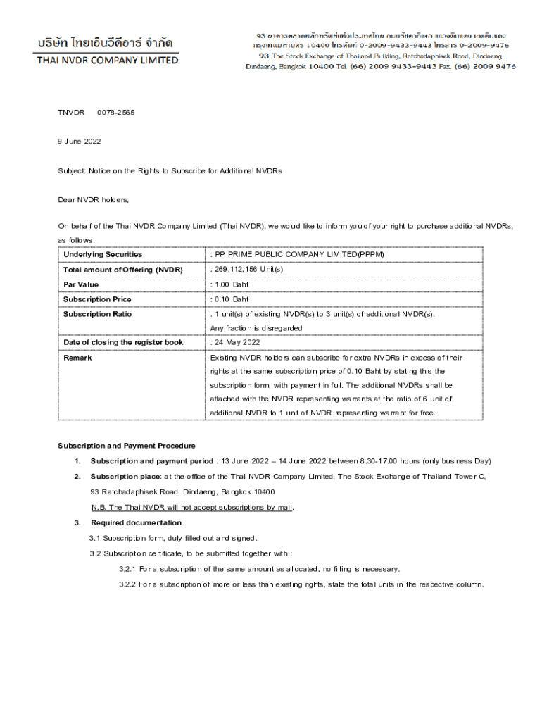 Get the free Notice on the Rights to Subscribe for Additional NVDRs Dear ...