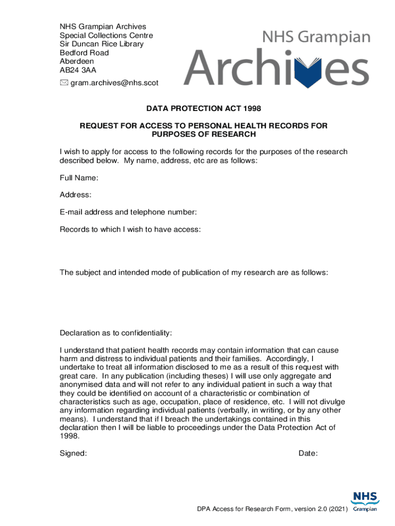 NHS Grampians Archives Special Collections Center Sir Duncan Rice Library Bedford Road Aberdeen AB24 3AA gram.archives@nhs.scotDATA PROTECTION ACT 1998 REQUEST FOR ACCESS TO PERSONAL HEALTH RECORDS