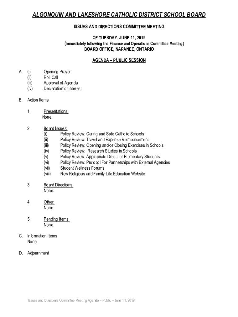 ALGONQUIN AND ASHORE CATHOLIC DISTRICT SCHOOL BOARD ISSUES AND DIRECTIONS COMMITTEE MEETING OF TUESDAY, JUNE 11, 2019 (immediately following the Finance and Operations Committee Meeting) BOARD OFFICE,