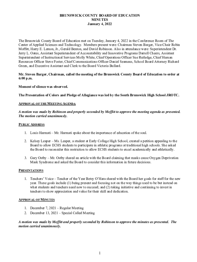 BRUNSWICK COUNTY BOARD OF EDUCATION MINUTES January 4, 2022The Brunswick County Board of Education met on Tuesday, January 4, 2022, in the Conference Room of The Center of Applied Sciences and Technology.