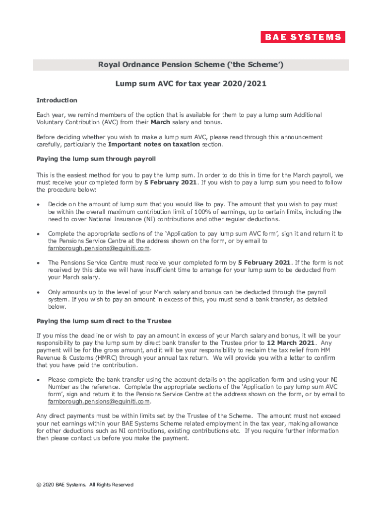 Royal Ordnance Pension Scheme (the Scheme) Lump sum AVC for tax year 2020/2021 Introduction Each year, we remind members of the option that is available for them to pay a lump sum Additional Voluntary
