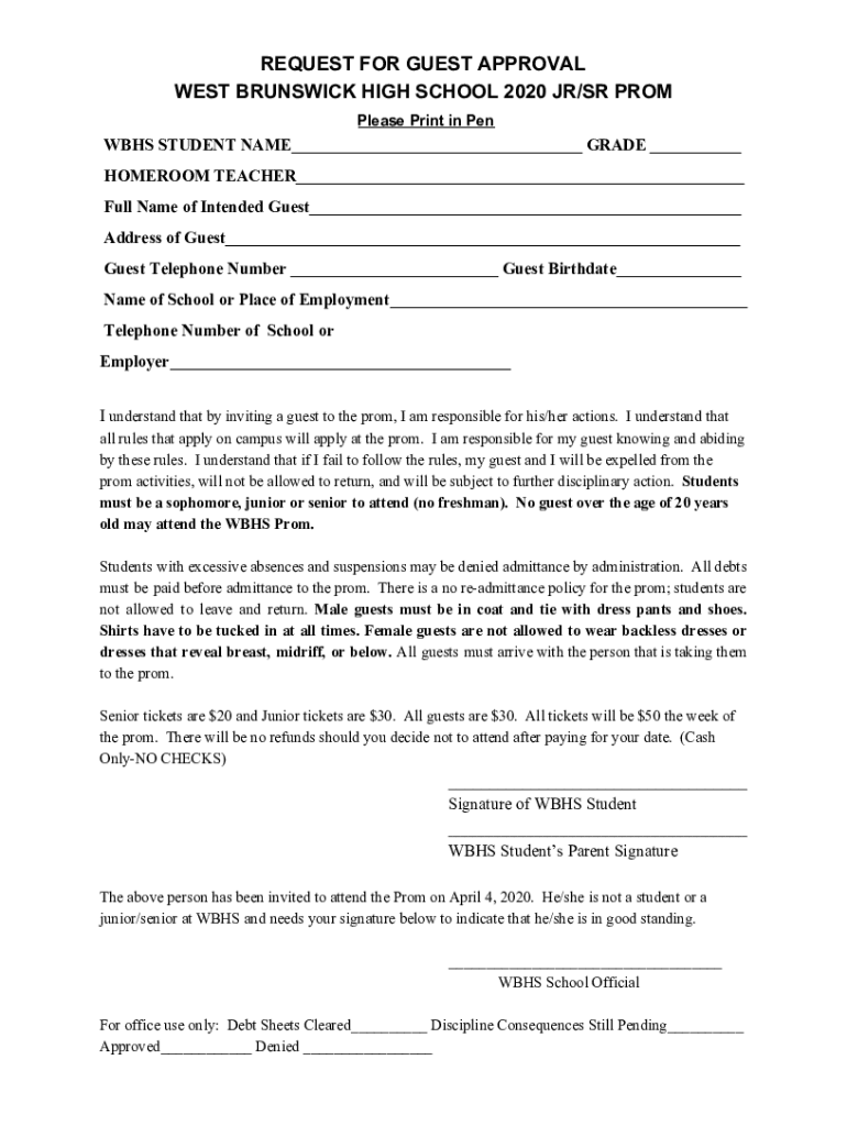 REQUEST FOR GUEST APPROVAL WEST BRUNSWICK HIGH SCHOOL 2020 JR/SR PROM Please Print in Lengths STUDENT NAME___ GRADE ___ HOMEROOM TEACHER___Full Name of Intended Guest___ Address of Guest___ Guest