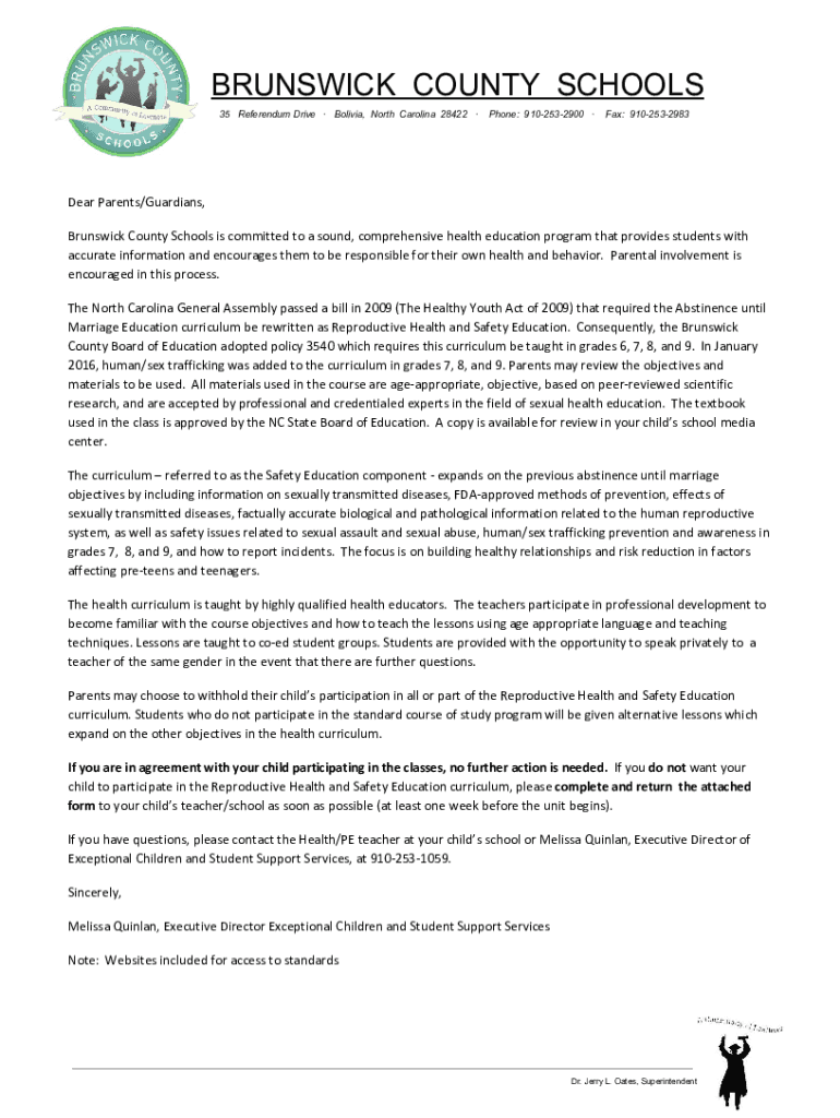 BRUNSWICK COUNTY SCHOOLS 35 Referendum Drive Bolivia, North Carolina 28422 Phone: 9102532900 Fax: 9102532983Dear Parents/Guardians, Brunswick County Schools is committed to a sound, comprehensive