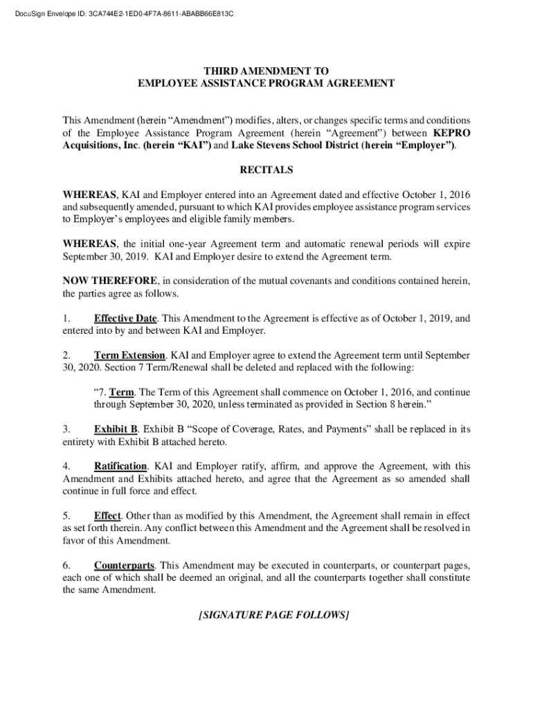 DocuSign Envelope ID: 3CA744E21ED04F7A8611ABABB66E813CRevised 6.18.18 by MP THIRD AMENDMENT TO EMPLOYEE ASSISTANCE PROGRAM AGREEMENT This Amendment (herein Amendment) modifies, alters, or changes
