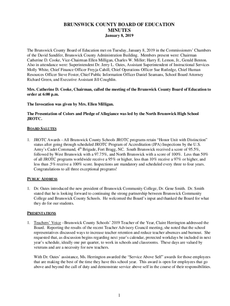BRUNSWICK COUNTY BOARD OF EDUCATION MINUTES January 8, 2019The Brunswick County Board of Education met on Tuesday, January 8, 2019, in the Commissioners Chambers of the David Sandier, Brunswick County