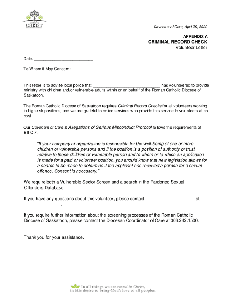 Covenant of Care, April 29, 2020APPENDIX CRIMINAL RECORD CHECK Volunteer Letter Date: ___ To Whom it May Concern:This letter is to advise local police that ___ has volunteered to provide ministry