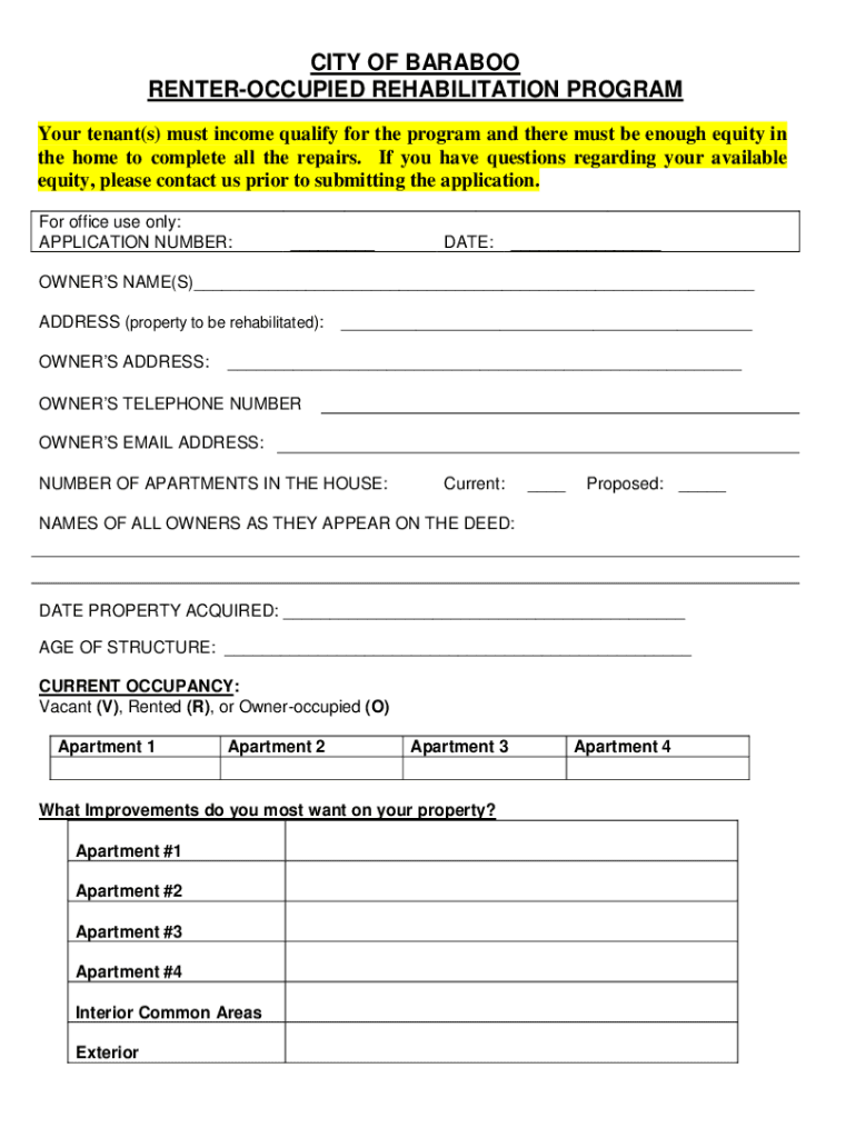 CITY OF BAMBOO RENTEROCCUPIED REHABILITATION PROGRAM Your tenant(s) must income qualify for the program and there must be enough equity in the home to complete all the repairs. If you have questions