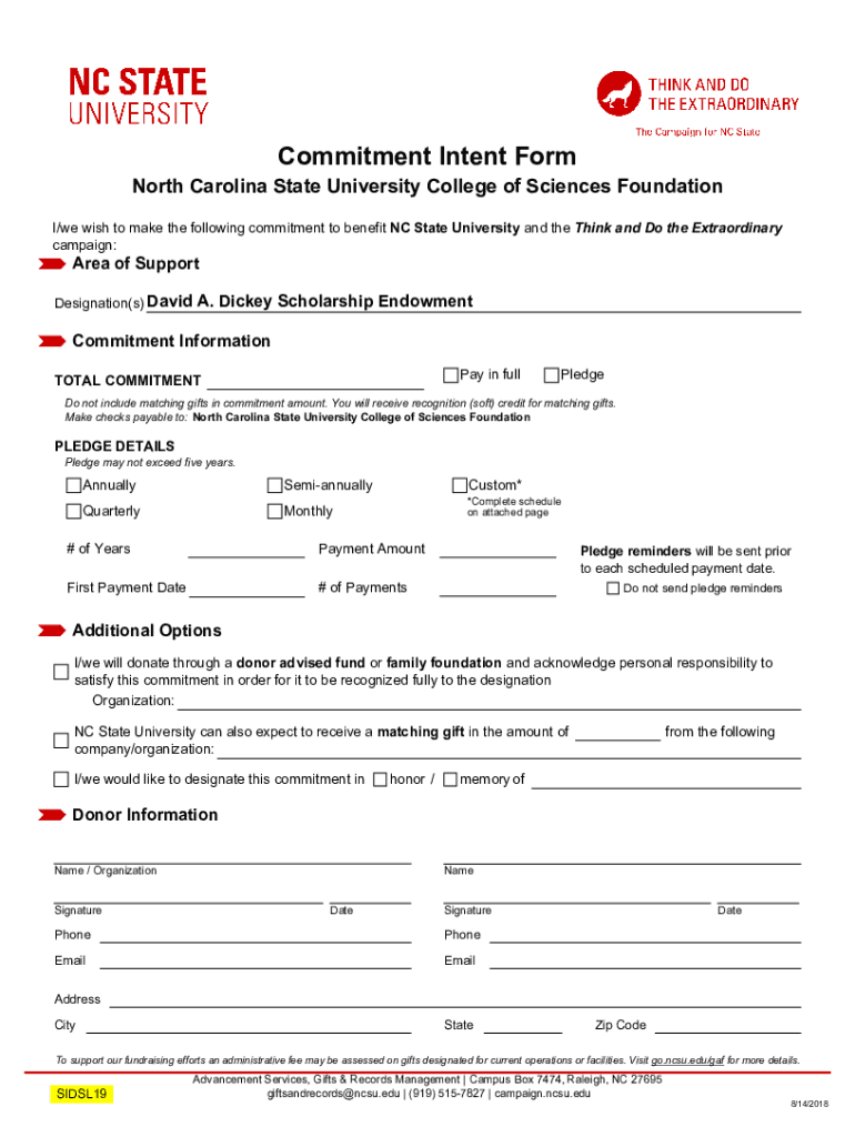 Commitment Intent Form North Carolina State University College of Sciences Foundation I/we wish to make the following commitment to benefit NC State University and the Think and Do the Extraordinary