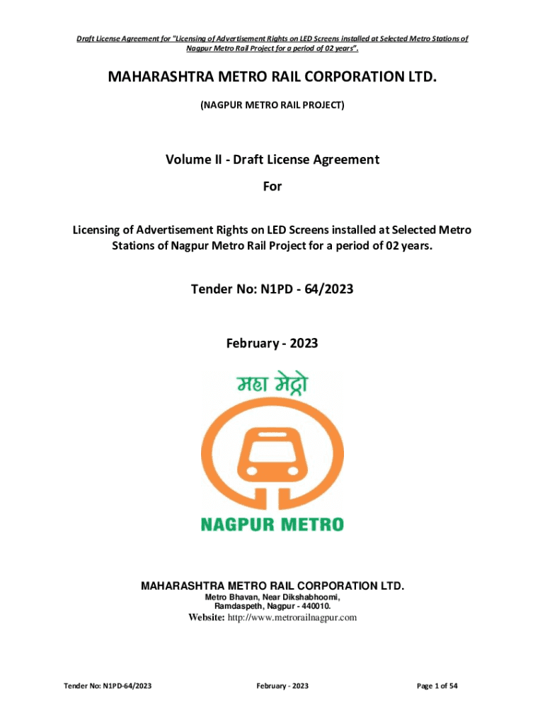 Draft License Agreement for \” Licensing of Advertisement Rights on LED Screens installed at Selected Metro Stations of Nagpur Metro Rail Project for a period of 02 years. MAHARASHTRA METRO RAIL