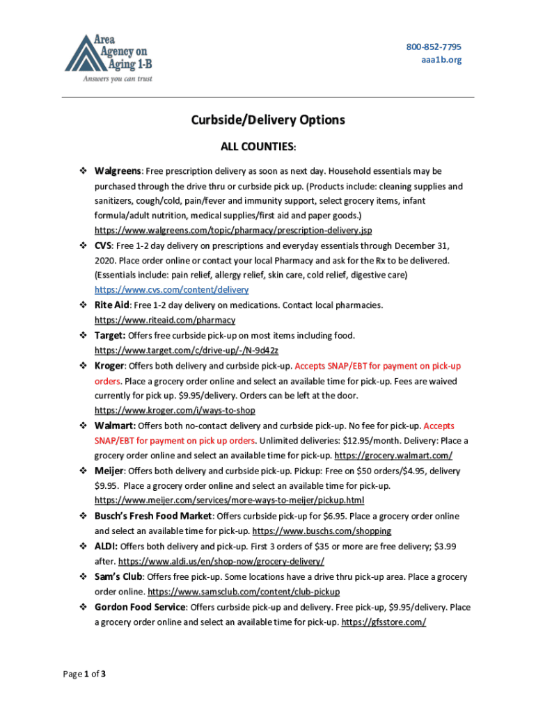 8008527795 aaa1b.orgCurbside/Delivery Options ALL COUNTIES: Walgreens: Free prescription delivery as soon as next day. Household essentials may be purchased through the drive through or curbside pick