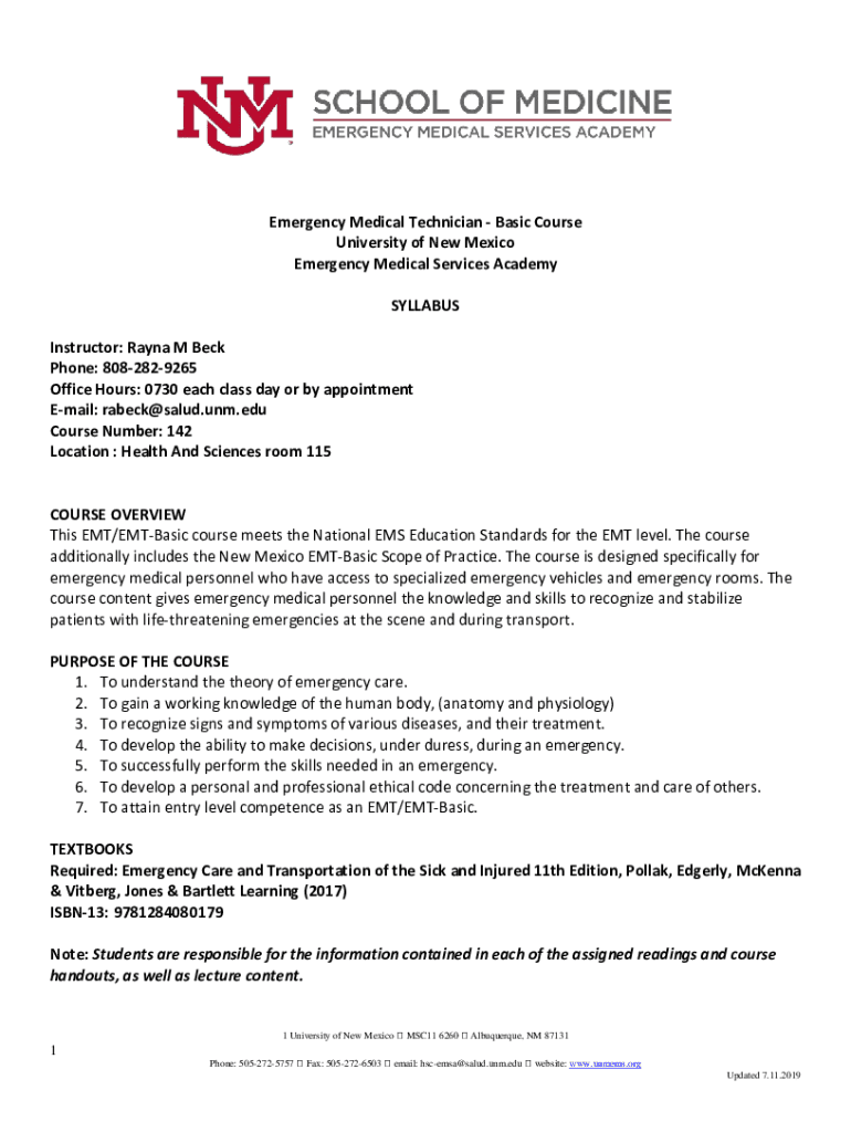 Emergency Medical Technician Basic Course University of New Mexico Emergency Medical Services Academy SYLLABUS Instructor: Reyna M Beck Phone: 8082829265 Office Hours: 0730 each class day or by appointment