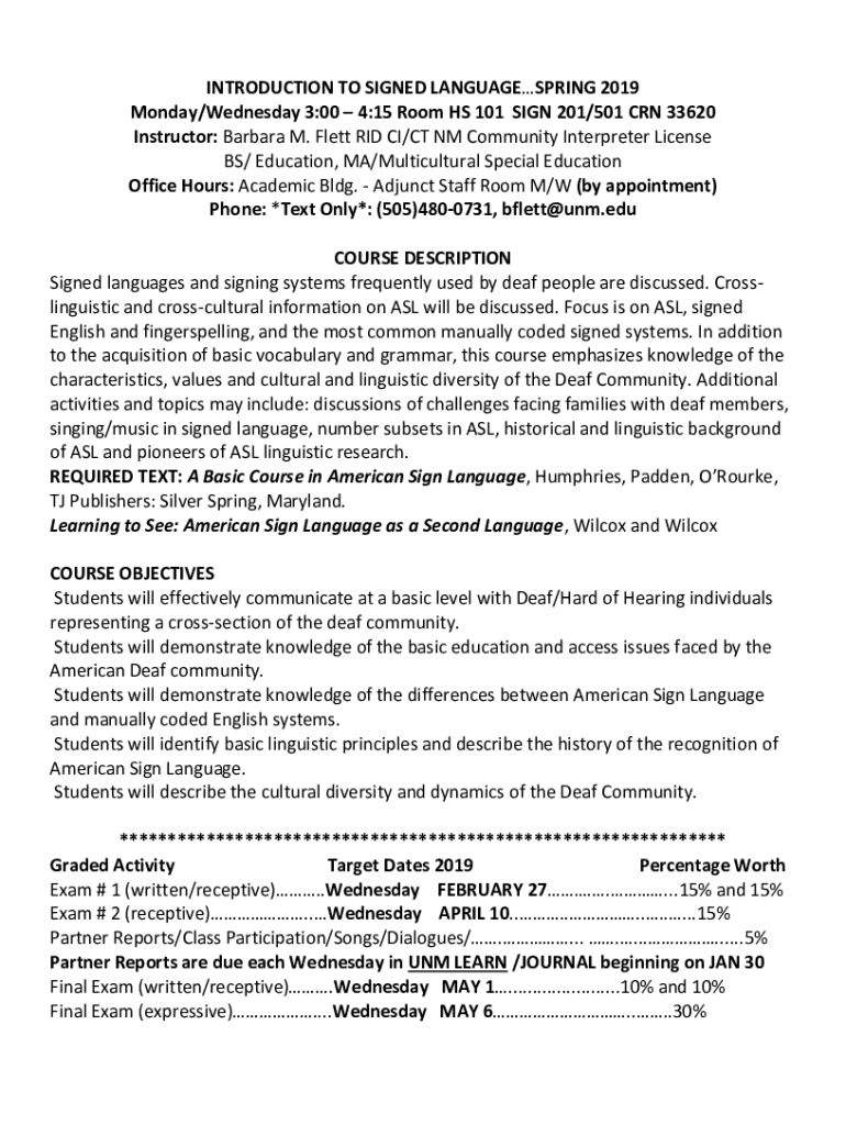 INTRODUCTION TO SIGNED LANGUAGESPRING 2019 Monday/Wednesday 3:00 4:15 Room HS 101 SIGN 201/501 CRN 33620 Instructor: Barbara M. Fleet RID CI/CT NM Community Interpreter License BS/ Education, MA/Multicultural