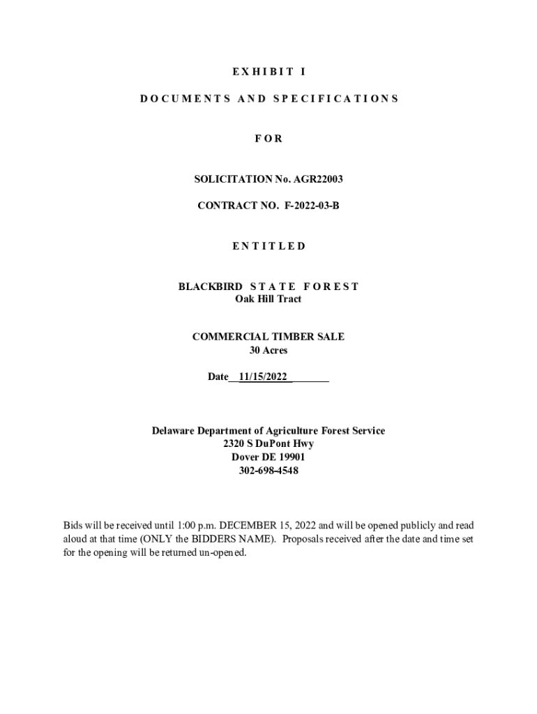 EXHIBIT I DOCUMENTS AND SPECIFICATIONS FOR SOLICITATION No. AGR22003 CONTRACT NO. F202203B ENTITLED BLACKBIRD S T A T E F O R E S T Oak Hill Tract COMMERCIAL TIMBER SALE 30 Acres Date__11/15/2022___Delaware