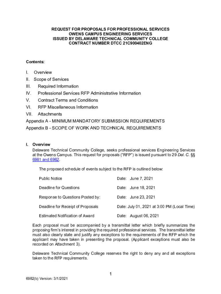 REQUEST FOR PROPOSALS FOR PROFESSIONAL SERVICES OWENS CAMPUS ENGINEERING SERVICES ISSUED BY DELAWARE TECHNICAL COMMUNITY COLLEGE CONTRACT NUMBER DCC 21C900402ENGContents:I. Overview. Scope of Services