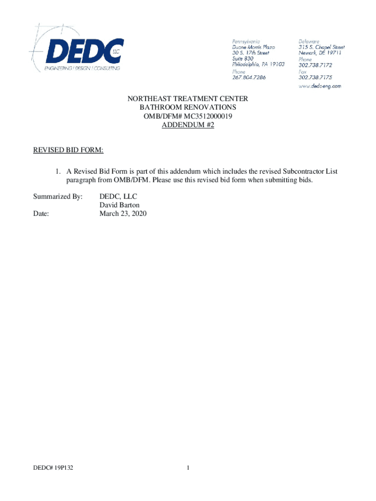 NORTHEAST TREATMENT CENTER BATHROOM RENOVATIONS OMB/DFM# MC3512000019 ADDENDUM #2 REVISED BID FORM: 1. A Revised Bid Form is part of this addendum which includes the revised Subcontractor List paragraph