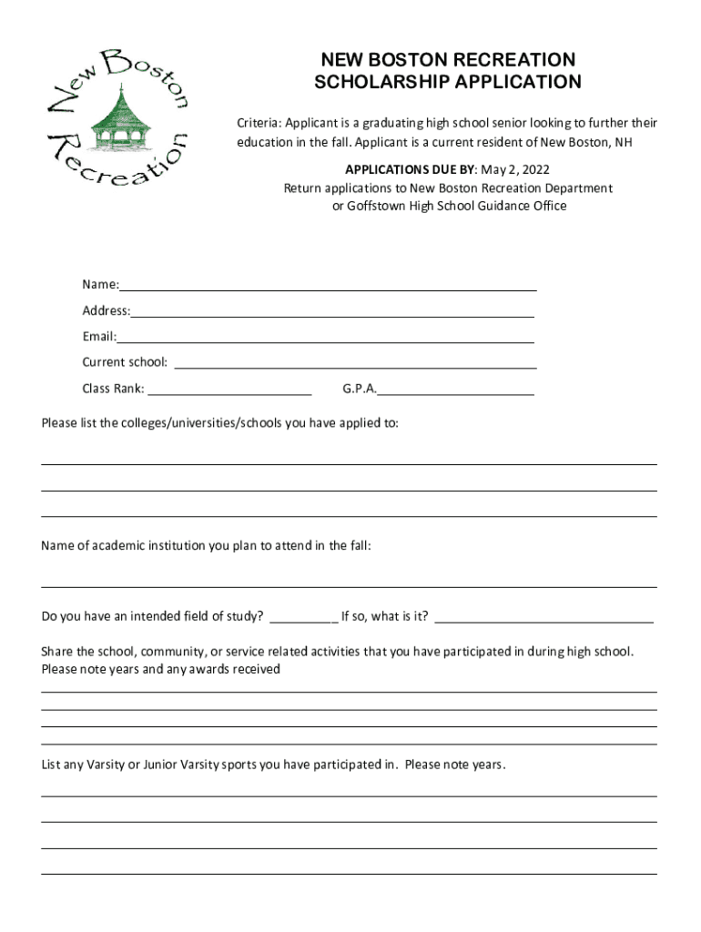 NEW BOSTON RECREATION SCHOLARSHIP APPLICATION Criteria: Applicant is a graduating from high school senior looking to further their education in the fall. Applicant is a current resident of New Boston,